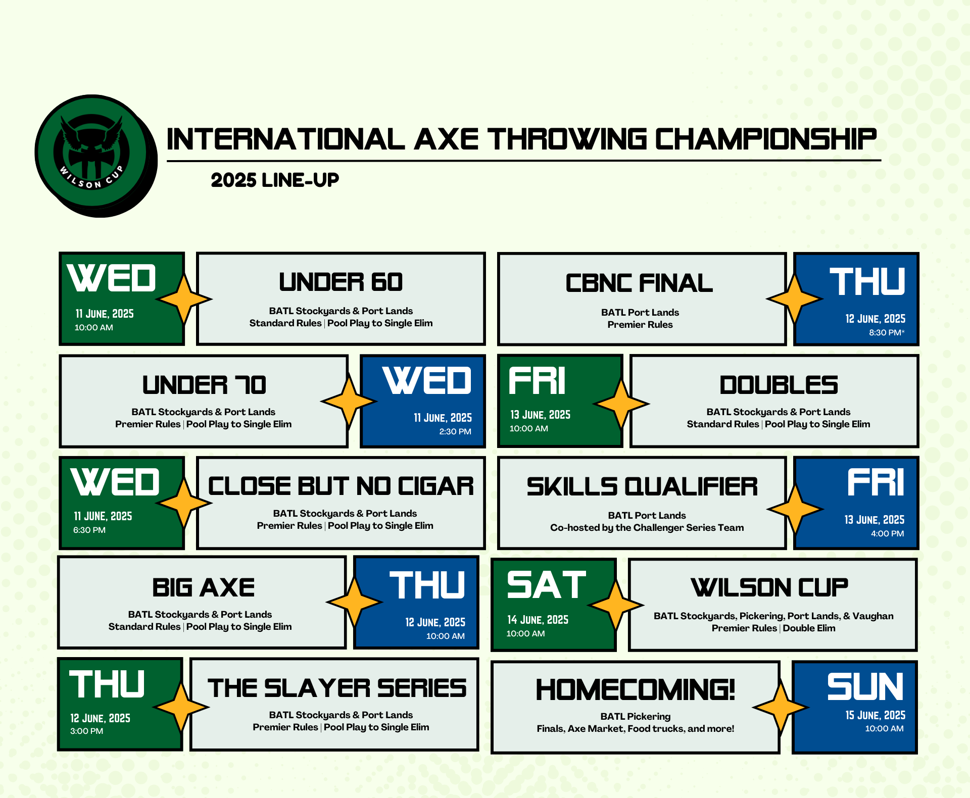The Awards Ceremony will be held at Homecoming immediately after the final axes are thrown and the after party will go on into the night.